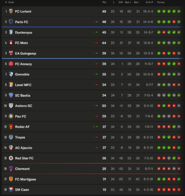 Les équipes comme le Grenoble Foot 38 et l’ESTAC Troyes, quant à elles, montrent des signes d’aspiration, cherchant à se rapprocher des places de promotion. Ces clubs s’efforcent de maintenir un bon rythme avec des résultats positifs lors des prochaines journées de championnat. À l’opposé, certains clubs comme le Dijon FCO et le Stade Malherbe de Caen luttent en bas de classement, cherchant à sortir d’une zone de relégation préoccupante.