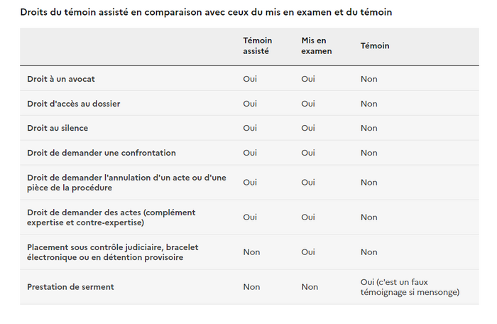 Le statut de témoin assisté est habituellement accordé à des individus qui, bien qu’ils ne soient pas directement accusés, peuvent apporter des éléments de preuve significatifs. Cette pratique a été introduite pour encourager les témoins à s’exprimer sans crainte de représailles ou de conséquences juridiques. Selon le Code de procédure pénale, être témoin assisté signifie que la personne a le droit d’avoir un avocat, étant donné qu’il existe un risque pour sa situation juridique.