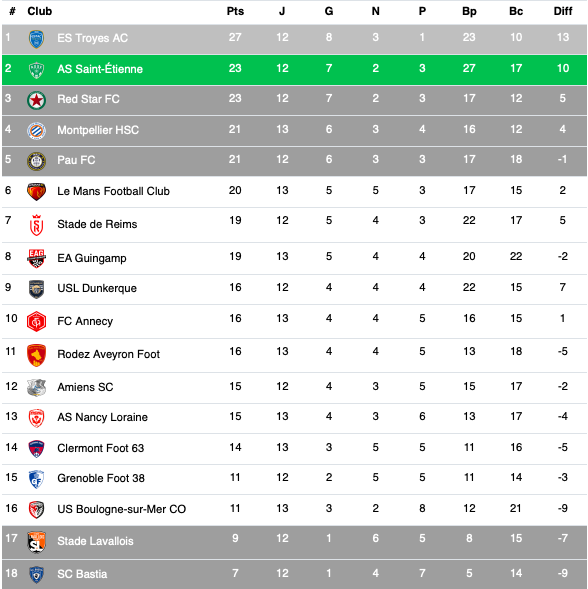 Troyes, leader avec 32 points mais qui doit encore jouer lundi soir contre Boulogne-sur-Mer, l’ASSE occupe la deuxième place avec 30 points. La lutte pour la montée s’annonce particulièrement serrée cette saison. L’AS Saint-Étienne, aussitôt remontés en Ligue 1, aussitôt redescendus, les Verts tenteront de continuer l’ascenseur. Le dernier match de la 17e journée a vu les Verts concéder le nul face à Bastia (2-2), résultat qui témoigne de la compétitivité du championnat.