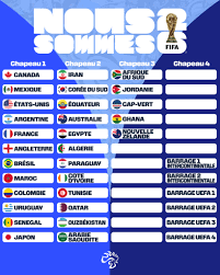 La France, actuellement troisième au classement FIFA, se retrouve dans le chapeau 1 qui rassemblera également les trois pays organisateurs (États-Unis, Mexique et Canada). Les Bleus rejoignent ainsi l’Espagne, l’Argentine, l’Angleterre, le Brésil, le Portugal, les Pays-Bas, la Belgique et l’Allemagne parmi les têtes de série.